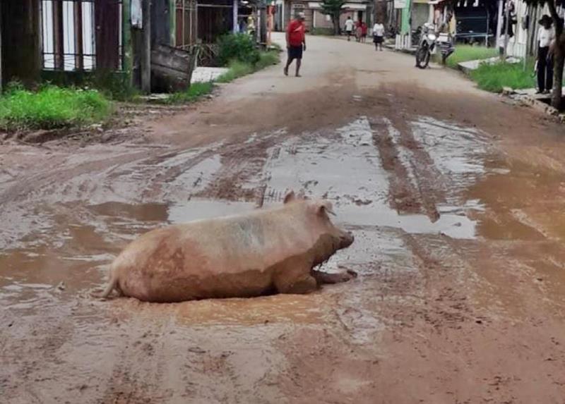 O jornalista e radialista morador da cidade de Tarauacá, Raimundo Accioly, publicou em seu perfil no Facebook uma imagem um quanto tanto inusitada: um porco com cerca de 100 quilos tomando banho de lama em uma das ruas de Tarauacá.