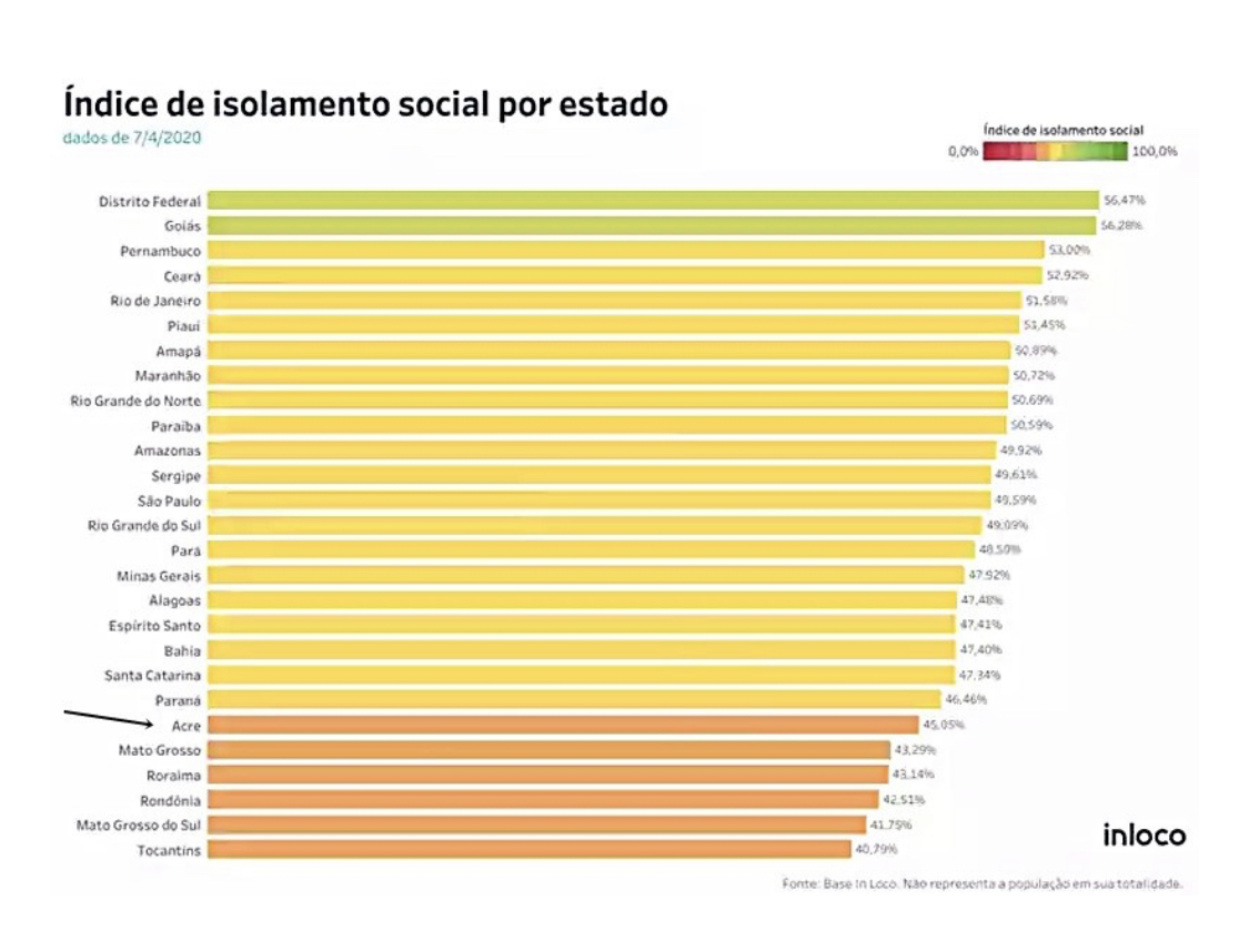 Um levantamento divulgado nesta quinta-feira (9) por uma empresa de softwares mostra que o Acre é o 6º estado em que a população mais desobedece o isolamento social para combater o coronavírus no Brasil.