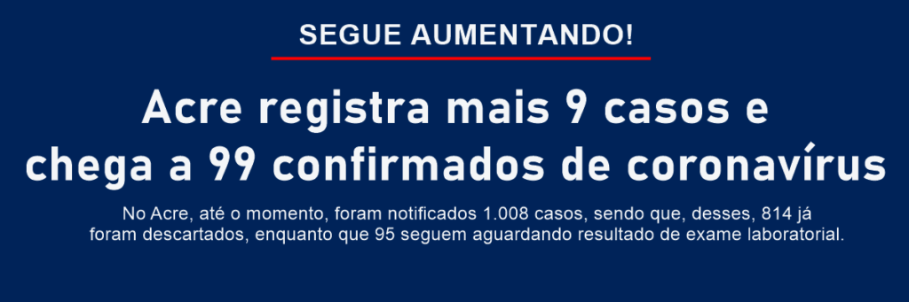 Por meio de boletim, o Acre registra 99 casos de contaminação por Covid-19, nesta terça-feira, 14, informa a Secretaria de Estado de Saúde do Acre (Sesacre). Em 24 horas, mais nove casos foram confirmados pelo Centro de Infectologia Charles Mérieux, de Rio Branco.