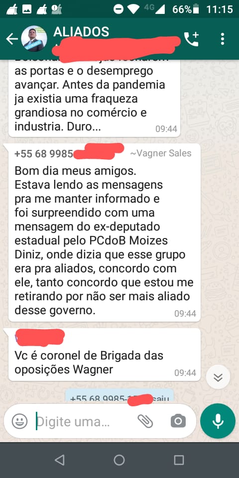 Circula nas redes sociais um print de um grupo intitulado “Alidados de Gladson Cameli”. Surpreso com os participantes, o ex-prefeito de Cruzeiro do Sul, Vagner Sales, decidiu sair do grupo.