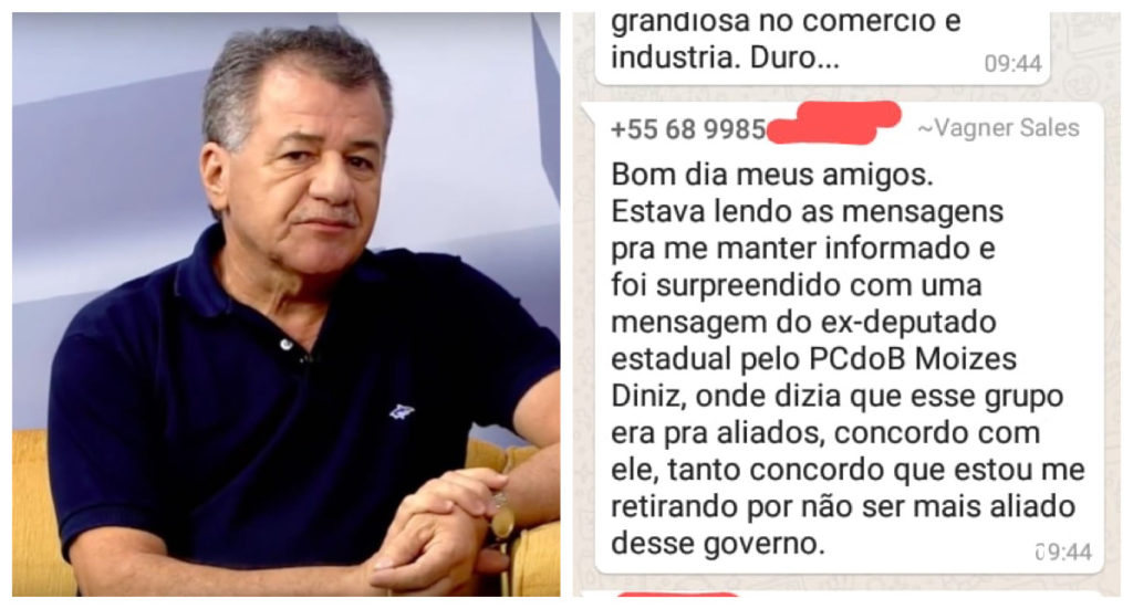 Em sua mensagem de despedida, o prefeito justifica: “Lendo as mensagens pra me manter informado fui surpreendido com a mensagem do ex-deputado Moisés Diniz, que dizia que esse grupo era pra aliados”.