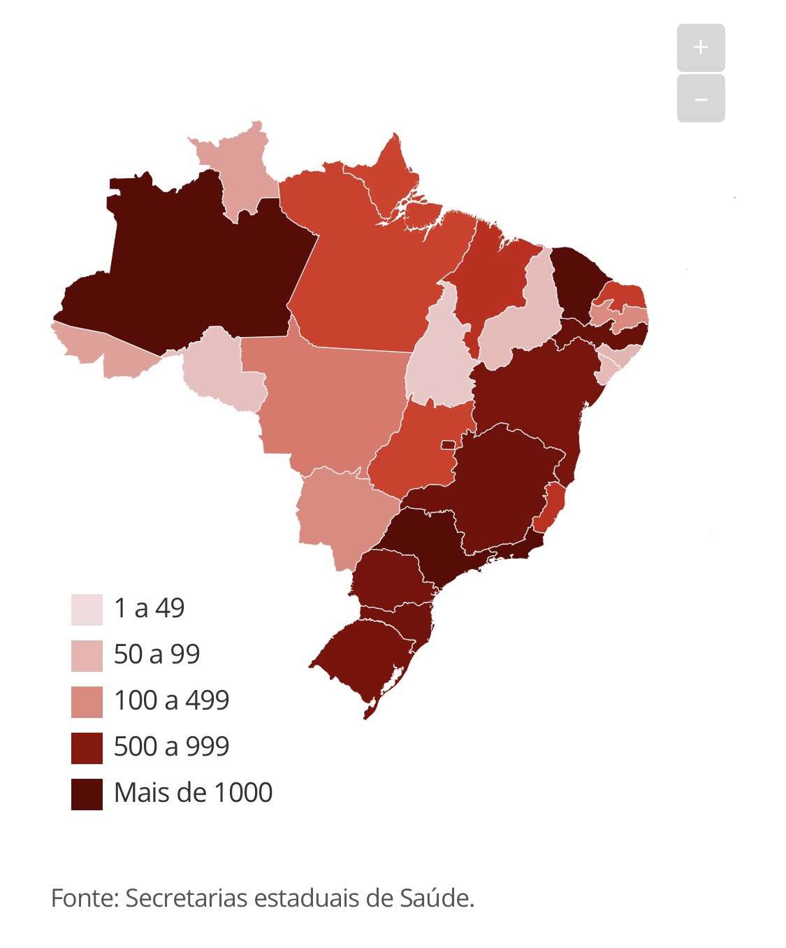 São Paulo e Rio de Janeiro são os estados com maior número de casos confirmados e mortes provocadas pela doença. O primeiro tem 8.419 casos e 560 mortos e, o segundo, 2.607 e 155.