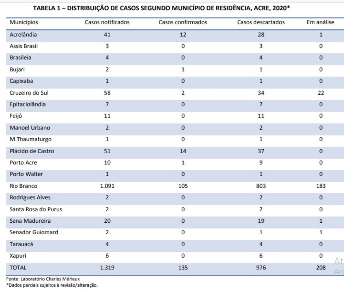 Dos 20 novos casos, apenas um é em Plácido, subindo para 14 registros da doença na cidade. Os outros são de Rio Branco, sendo seis servidores públicos, de 21 anos, outro de 31, um de 37 anos, um de 33 anos, outro de 38, e um de 53 anos, todos homens.