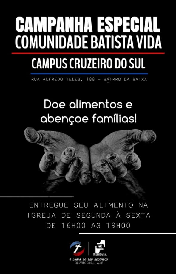 Em decorrência da restrição de atividades comerciais, devido a crise do novo coronavírus, a direção da igreja Comunidade Batista Vida, em Cruzeiro do Sul, lançou uma campanha de arrecadação de alimentos.