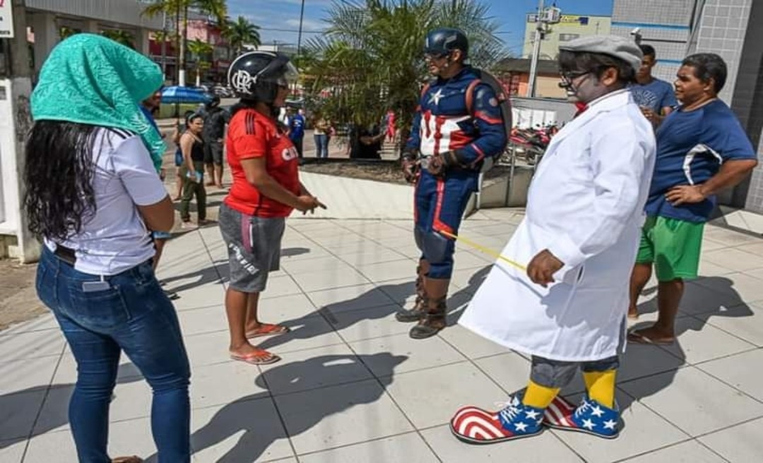 Há duas semanas, um artista que se veste de Capitão América trabalha nas ruas de Cruzeiro do Sul tentando conscientizar as pessoas sobre os riscos de aglomerações em meio a epidemia de coronavírus.