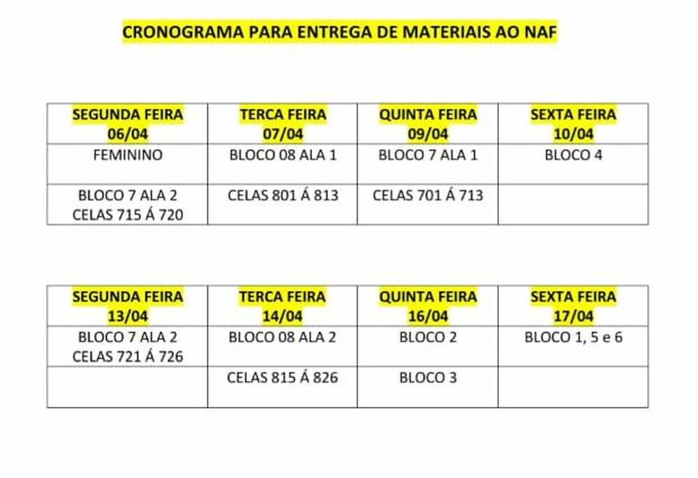 Caso a entrega não obedeça ao cronograma, ela não será recebida. O atendimento será das 8h às 12h e das 13h às 16h, com uma quantidade mínima de servidores e respeitando as recomendações de higienização. Em Cruzeiro do Sul, as entregas podem ser feitas na Linha do Divisor, KM 10, bairro Formoso, onde fica o presídio na cidade.