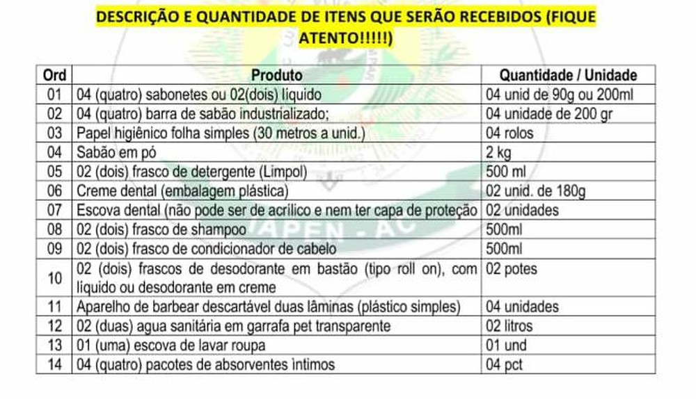 Porém, um novo cronograma foi feito para que os kits de higiene e limpeza fossem recebidos, já que são considerados itens essenciais neste período. Ao todo, são 14 itens autorizados pela unidade de Cruzeiro do Sul.