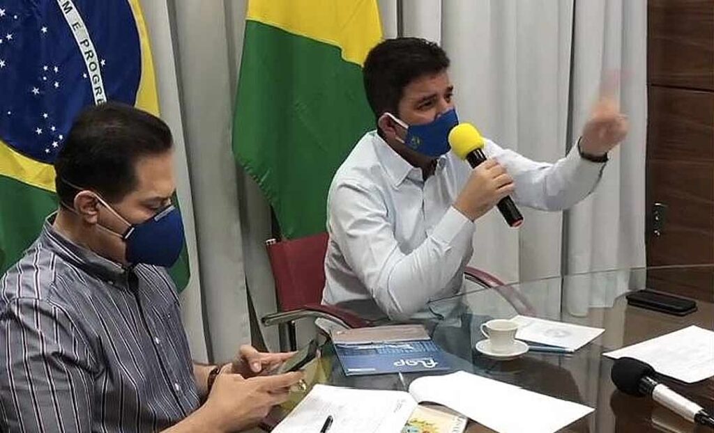 O governador conversou com os deputados por videoconferência direto da Casa Civil. Ao lado dele estavam o conselheiro do governo, Normando Sales, e o chefe da Casa Civil, Ribamar Trindade.