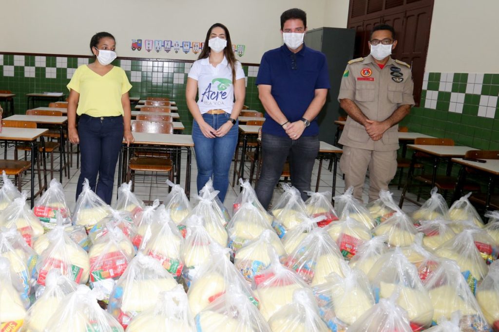 Na manhã desta sexta-feira,10, o governador Gladson Cameli fez a entrega simbólica de kits alimentícios em duas escolas do município. Só na escola estadual cívico-militar Madre Adelgundes Becker serão 369 famílias de alunos beneficiadas. Na escola Luiz Antônio Meirim Pedreira outras 108.