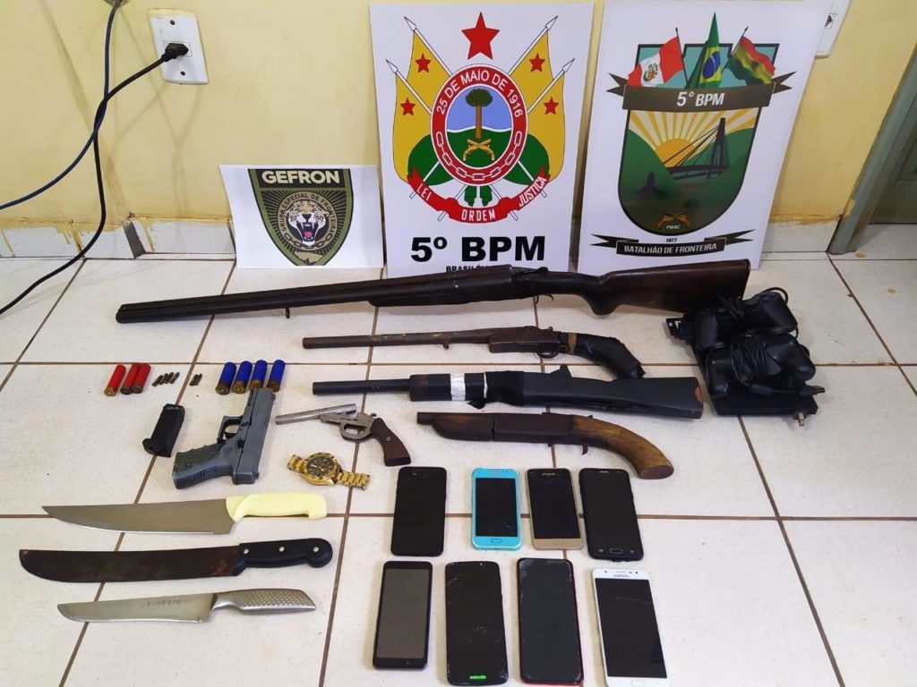 Policiais militares do 5º Batalhão da Polícia Militar do Acre (PMAC), com o apoio do Grupo Especial de Fronteira (Gefron), iniciaram uma operação na madrugada desta segunda-feira, 13, na qual conseguiram prender nove pessoas e apreender cinco armas de fogo, além de um simulacro e outros itens provavelmente oriundos de crimes. As ações aconteceram no bairro Leonardo Barbosa, em Brasileia.