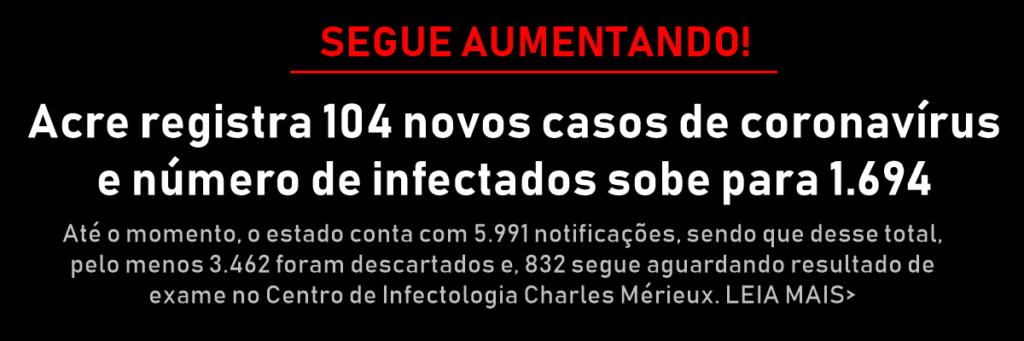 Mais 104 casos foram registrados em 24 horas, no Acre, fazendo subir de 1.590 para 1.694 o número oficial de infectados pelo coronavírus.