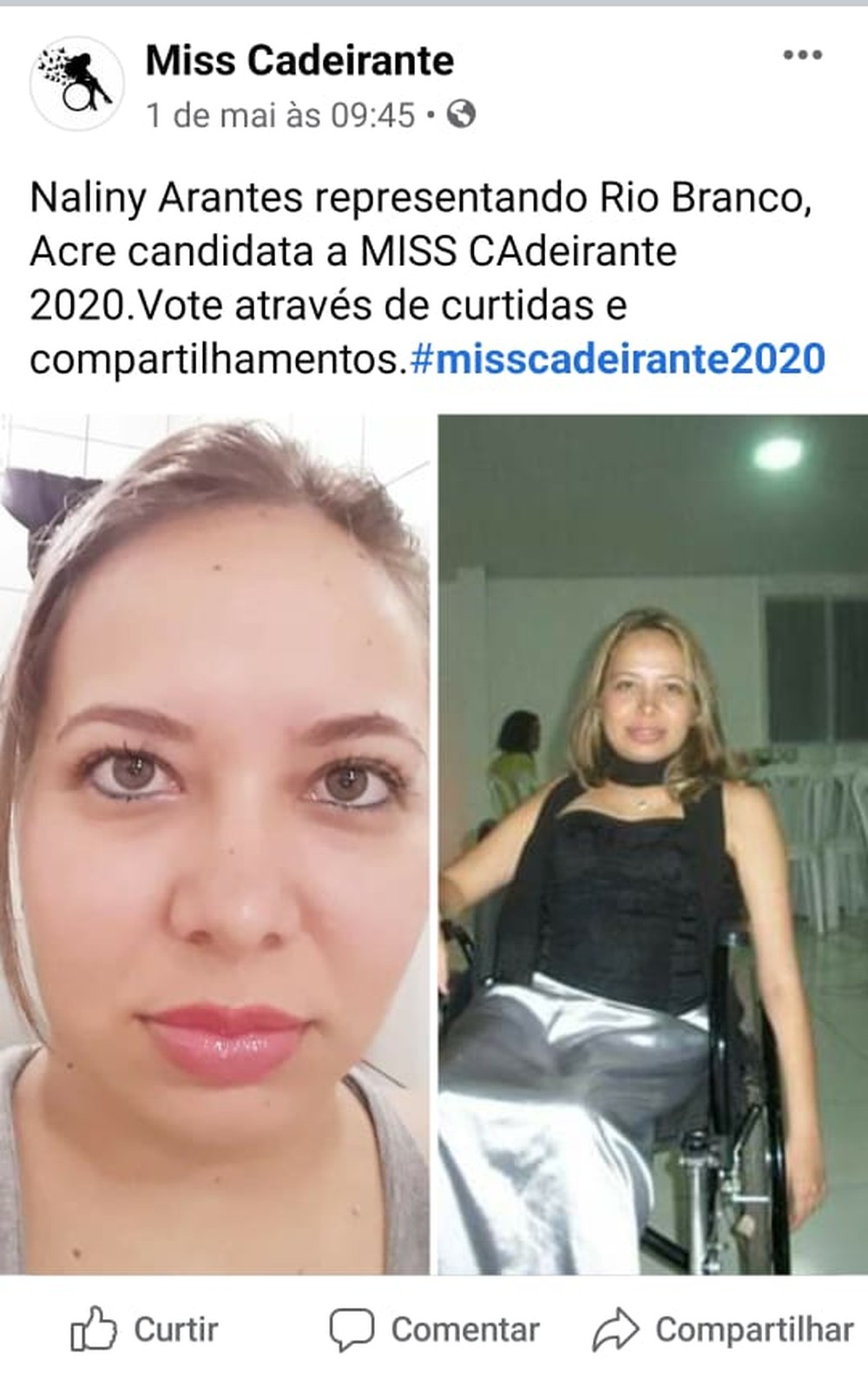 A acrena Naliny Arantes, de 32 anos, participa de um concurso nacional de miss cadeirante. O evento ocorre de forma virtual e as candidatas enviam as fotos, que são publicadas nas redes sociais do concurso e a eleição é feita por meio de curtidas, comentários e compartilhamentos.