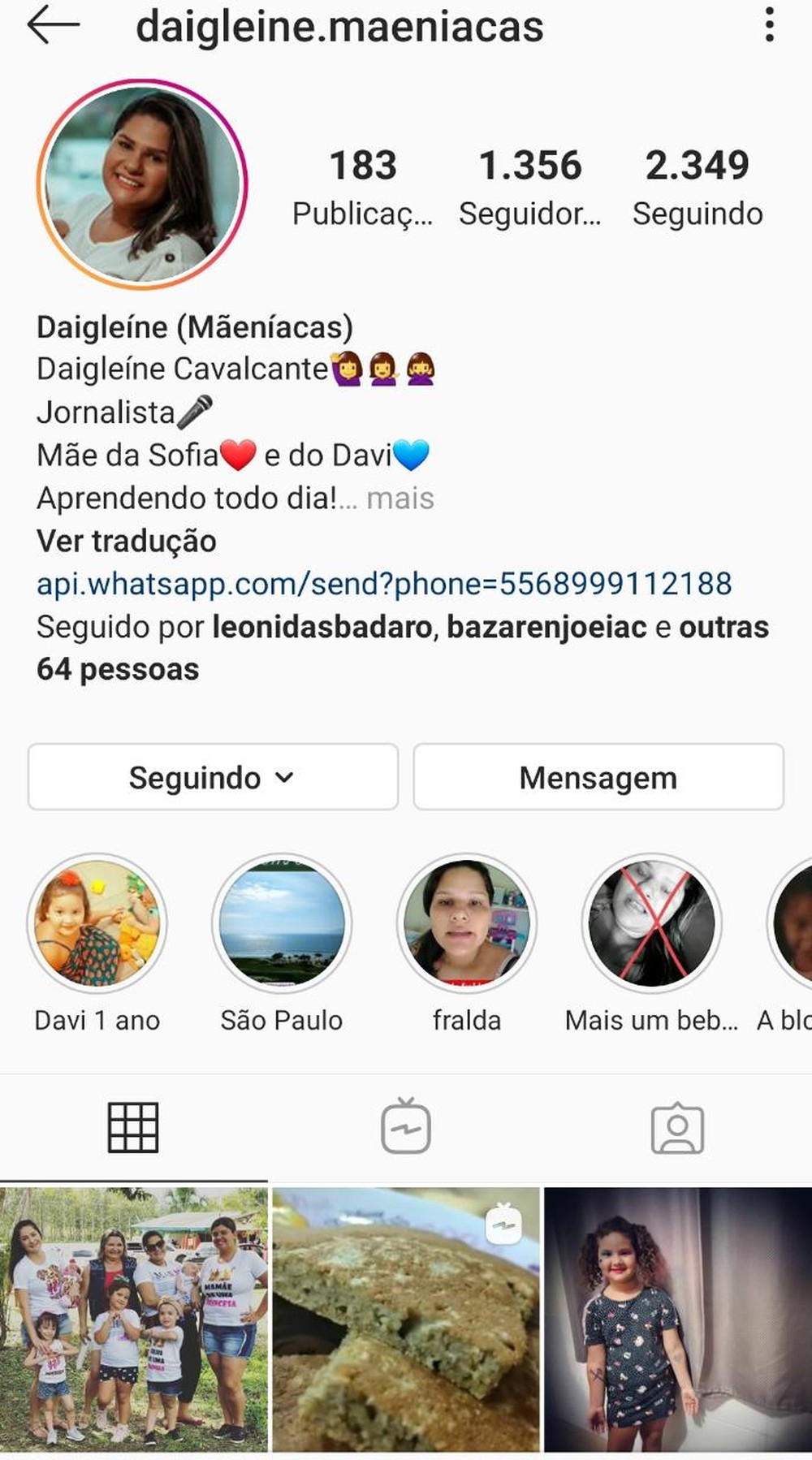 Há três anos, ela criou o perfil “maeníacas” para dividir as dificuldades e fases da maternidade. Com vídeos, fotos e compartilhamentos do crescimento de Sofia Maciel, de 5 anos, e Davi Maciel, de 1 ano, a mãe mostra o dia a dia da família, as descobertas das crianças, ensina receitas, dá dicas e divide tudo com outras mães.
