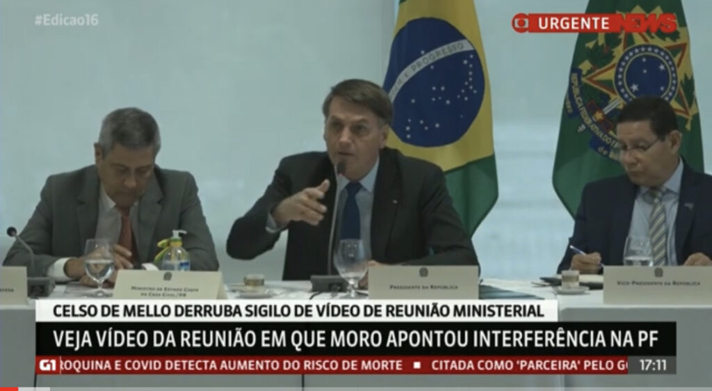 Durante a reunião ministerial do dia 22 de abril, o presidente Jair Bolsonaro(sem partido) chamou o governador de São Paulo, João Doria (PSDB), de “bosta” e o governador do Rio de Janeiro, Wilson Witzel (PSC) de “estrume”, conforme vídeo divulgado nesta sexta-feira (22)pelo ministro do Supremo Tribunal Federal (STF) Celso de Mello.