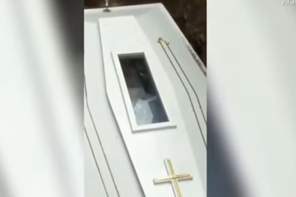 Na gravação feita durante a cerimônia fúnebre, o padre recita: “Deus disse no livro de João, ‘Eu sou a ressurreição e a vida; quem crê em mim, ainda que esteja morto, viverá’”. No momento seguinte, eis que a cena chocante aconteceu.