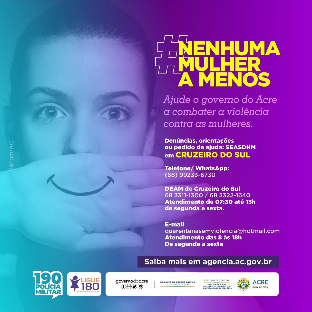 Com o isolamento social, o caso de violência doméstica contra mulheres cresceu no país. Em Cruzeiro do Sul não é diferente. Pensando em coibir esses crimes e incentivar as denúncias de violência, o Governo do Estado através do gabinete da primeira dama lançaram a campanha “Nenhuma Mulher a Menos”.