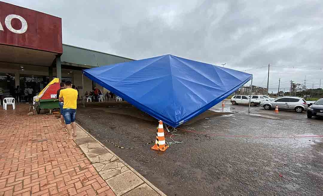 A cobertura da tenda instalada na frente da UPA do 2º Distrito de Rio Branco desabou depois que um dos suportes se desprendeu da estrutura de lona durante a chuva com ventos fortes na manhã deste sábado, 23.