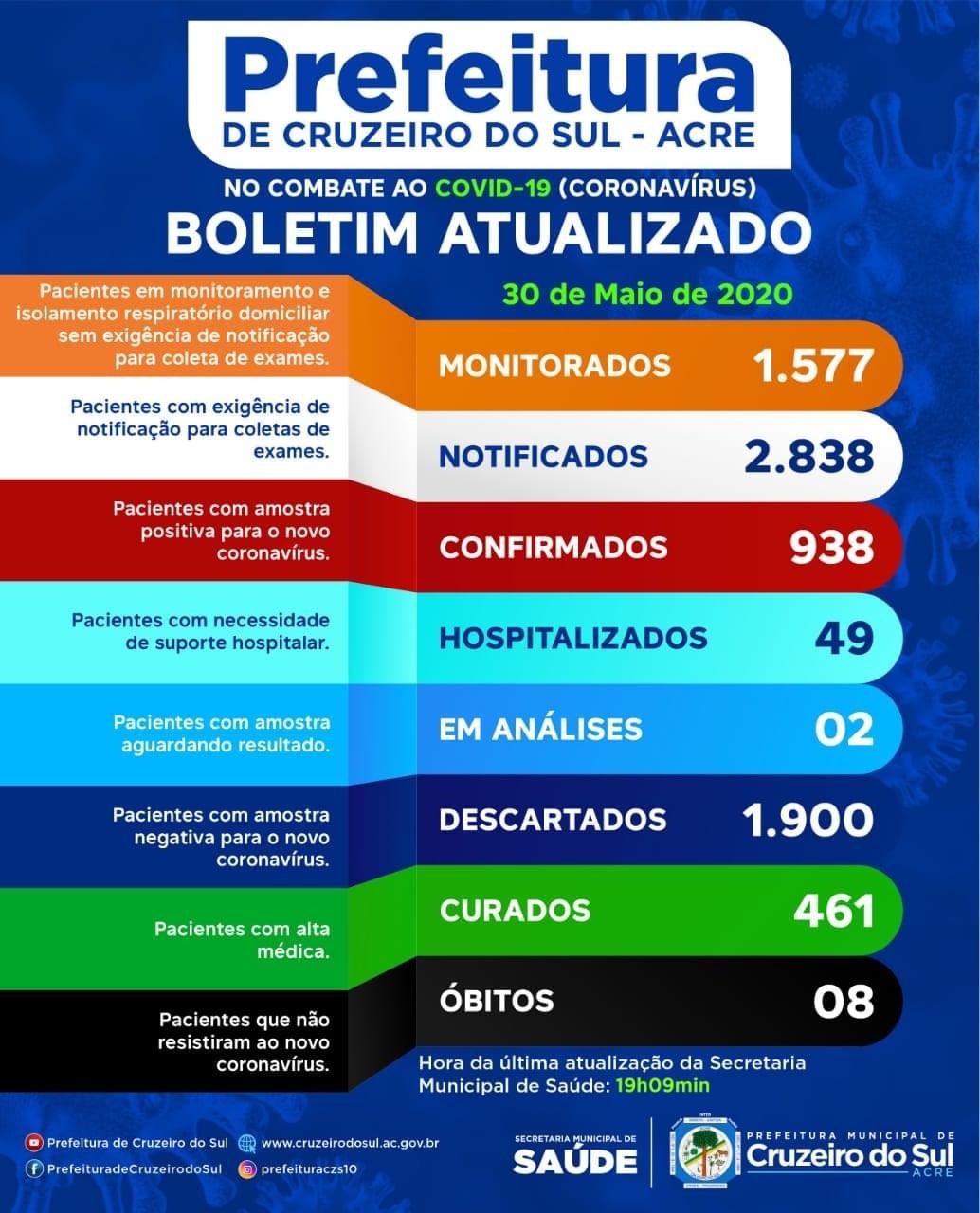 A Secretaria Municipal de Saúde de Cruzeiro do Sul registrou 76 novos casos de contaminação por coronavírus neste sábado (30). Em 24 horas, o número oficial de casos confirmados subiu de 862 para 938.
