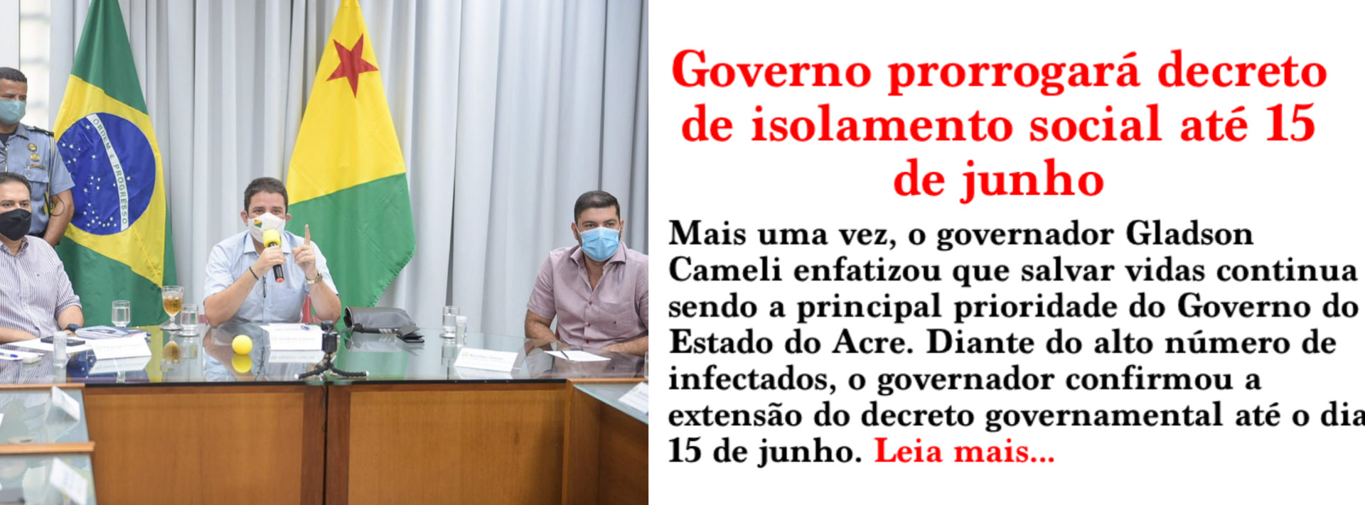 Mais uma vez, o governador Gladson Cameli enfatizou que salvar vidas continua sendo a principal prioridade do Governo do Estado do Acre. Diante do alto número de infectados, o governador confirmou a extensão do decreto governamental até o dia 15 de junho.