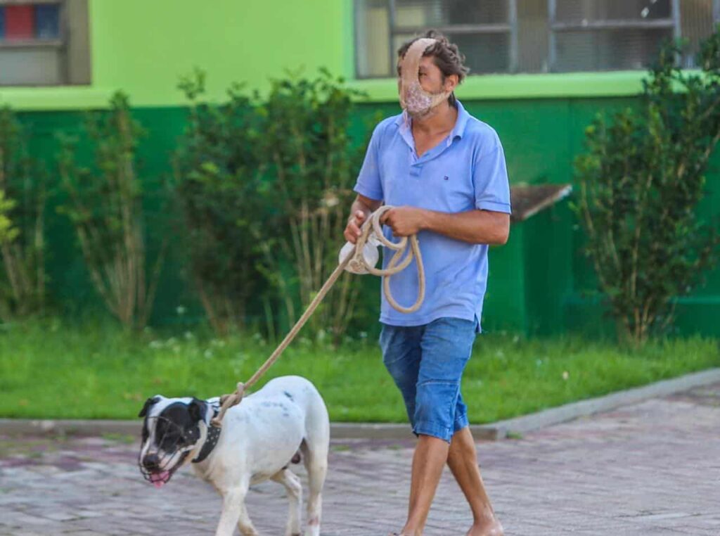 Um homem não identificado foi flagrado na tarde desta terça-feira, 12, passeando com um cachorro, no centro de Rio Branco, com uma calcinha no rosto, como se fosse uma máscara para protegê-lo da Covid-19, que já vitimou 51 pessoas no Acre.