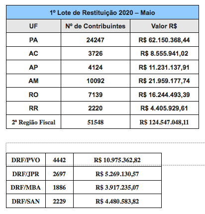 Na 2ª Região Fiscal (AC, AP, AM, PA, RO e RR) foram entregues 782.191 declarações e 51.548 contribuintes receberão o valor total de R$ 124.547.048,11 no primeiro lote de restituição do IRPF 2020.