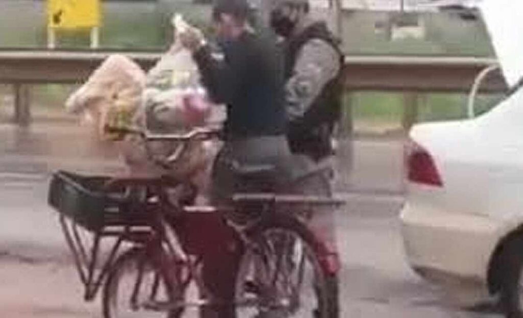 O vendedor ambulante caminhava com sua bicicleta cargueira na BR-364 quando foi surpreendido pelos PMs que lhe entregaram o sacolão.