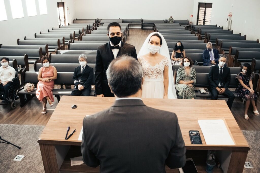 O administrador Rafael Gonçalves Abdala e a advogada Débora Emi Yamamoto ouviram a frase “até que a morte os separe” no último sábado (2). A união foi realizada em uma igreja do município e contou com transmissão pela web para os parentes que não puderam comparecer por causa do distanciamento social..