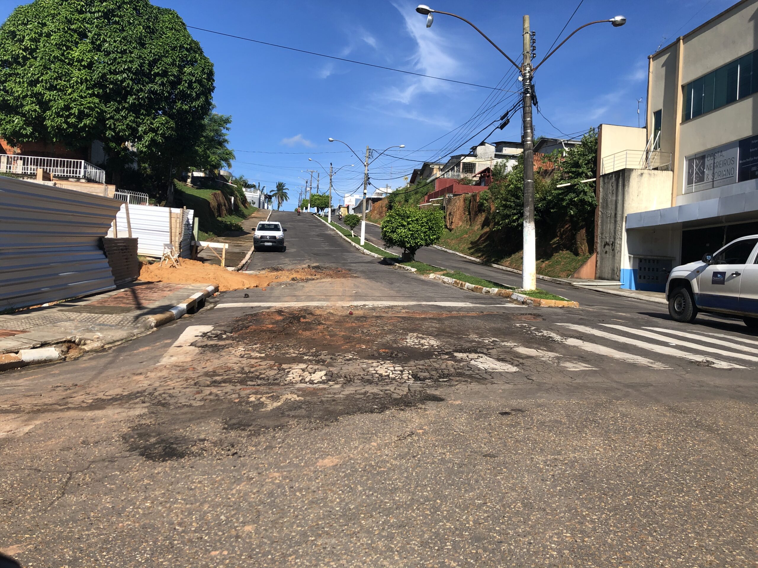 A instalação da nova sede do banco Sicoob está causando transtorno e danificando a estrutura física das calçadas e via da Avenida Coronel Mâncio Lima em Cruzeiro do Sul.