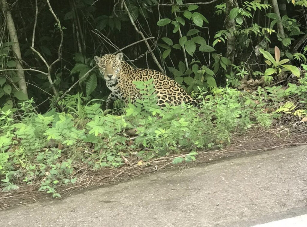 “Estávamos passando pela reserva quando meu marido avistou a onça na beira da BR, saindo da mata. Eu acho que ela ia atravessar a estrada. Diminuímos a velocidade do carro e foi como conseguimos registrar as fotos”, relatou.