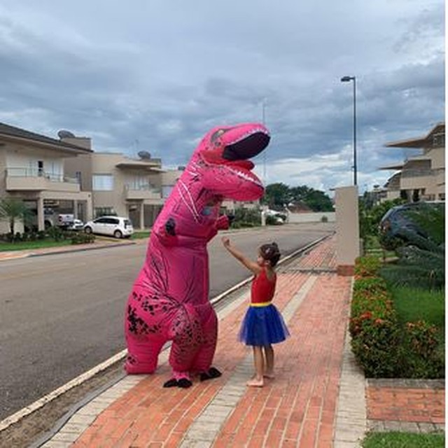Há mais de 40 dias sem encontros presenciais com a filha por causa da pandemia do novo coronavírus, o cirurgião dentista Paulo Roberto Pires, 35 anos, colocou fim ao distanciamento. Ele achou uma alternativa diferente, mas que deixasse a filha feliz, ele, então, alugou um dinossauro inflável para poder abraçar a pequena Marina Diniz, de 5 anos, que adorou a alternativa do pai.