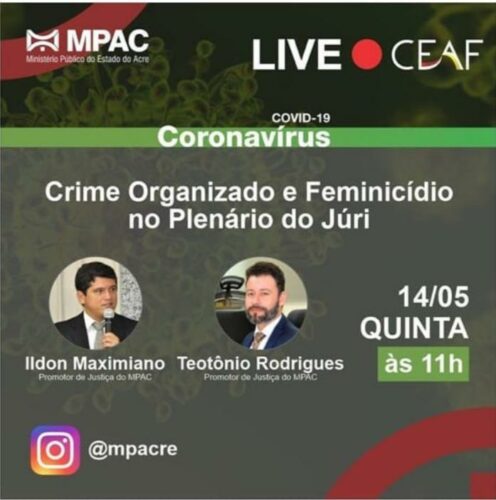 “Os demais serão os desafios do júri no âmbito dos homicídios praticados por ações de organizações criminosas; o que incluirá, dentre outras coisas, as ações de terror e crueldade. Além das as ações de suposta bondade nesse período pelo qual passamos. Falaremos de feminicídio também. O Acre hoje é o campeão nacional de feminicídios e vale a menção”, afirmou Ildo Maximiano. O promotor destacou que a live destina-se ao público em geral com pouco uso de termos técnicos.