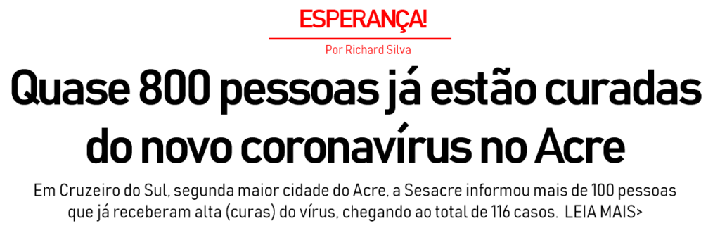 Em Cruzeiro do Sul, segunda maior cidade do Acre, a Sesacre informou mais de 100 pessoas que já receberam alta (curas) do vírus, chegando ao total de 116 casos.