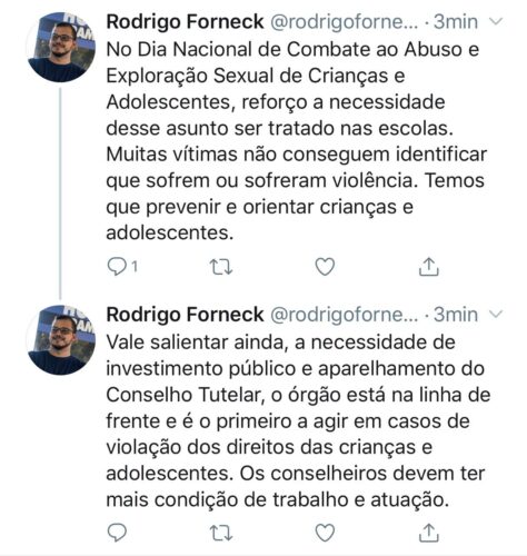 Em suas redes sociais, Rodrigo divulgou a campanha do Ministério Público do Acre (MP\AC), que reforça a importância da denúncia. Segundo estudo, entre 2011 e 2017, o Brasil teve um aumento de 83% nas notificações de violência sexuais contra crianças e adolescentes.