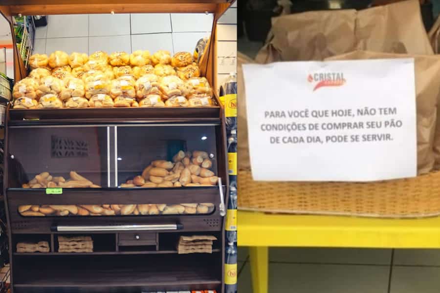 “Para você que hoje não tem condições de comprar seu pão de cada dia pode se servir”, diz o cartaz exposto. A bela iniciativa foi muita elogiada por clientes e internautas.