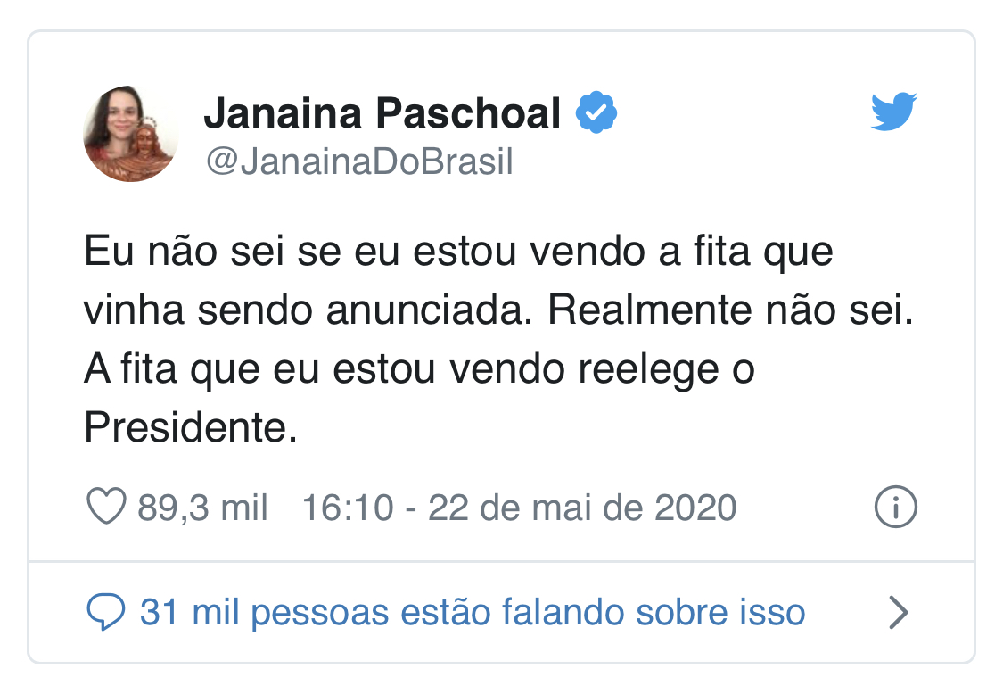 A deputada estadual Janaina Paschoal (PSL-SP), que recentemente teceu críticas a Jair Bolsonaro, deu a entender que a divulgação do vídeo da reunião ministerial pode ser positiva para o atual governo. Ainda, ela observou que não viu crime algum nas imagens que foram a público.