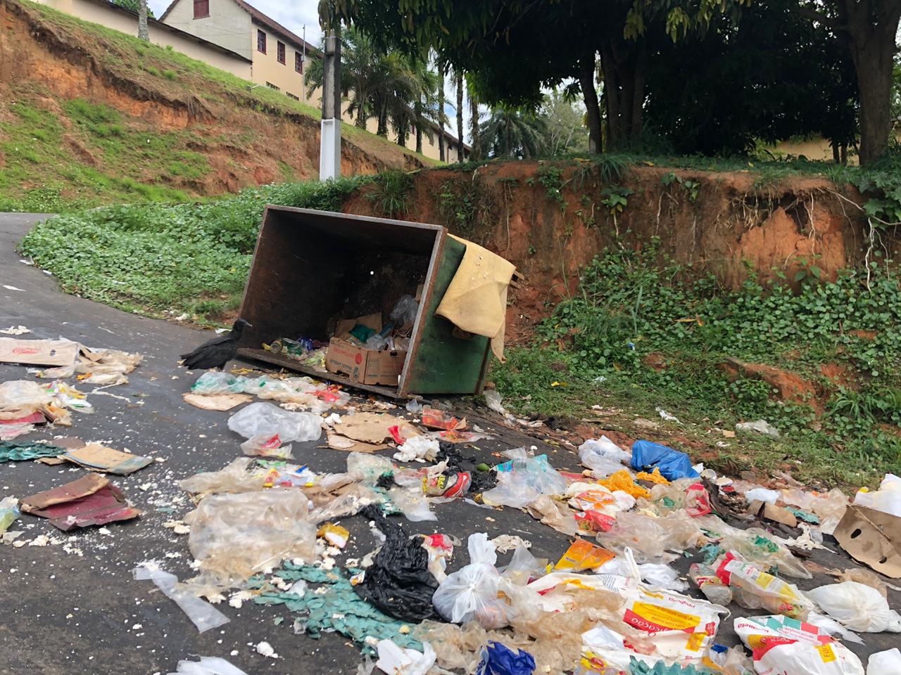 Segundo ele, por volta das 22h, dois homens que estavam em uma moto pararam e viraram a caixa de lixo da rua. Nas fotos é possível ver que ficou bastante lixo espalhado pela rua.