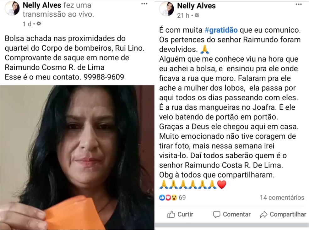 “Quando cheguei em casa foi que abri e vi que tinha os R$ 500, duas receitas médicas, um papel com números e um comprovante de saque dos R$ 500. Como hoje em dia a gente resolve quase tudo pela internet, fiz uma transmissão dizendo que tinha acabado de achar e pedindo que quem pudesse compartilhar na tentativa de acharmos o dono”, contou.