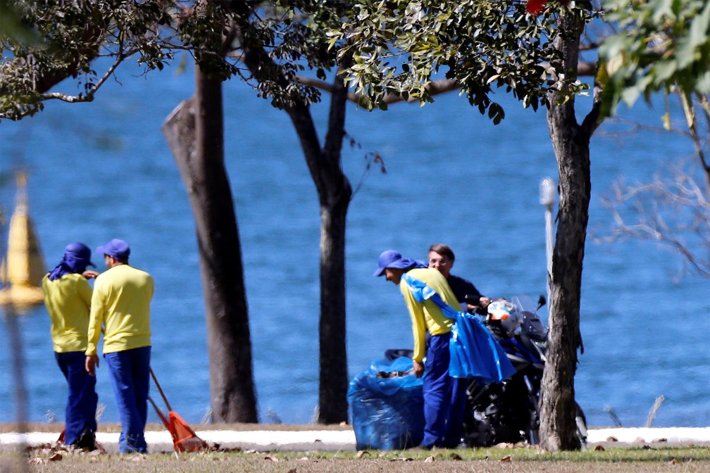 As imagens do passeio foram feitas pelo repórter-fotográfico Adriano Machado, da agência Reuters. Não é possível, com base nas fotos, a distância de Bolsonaro para os garis.