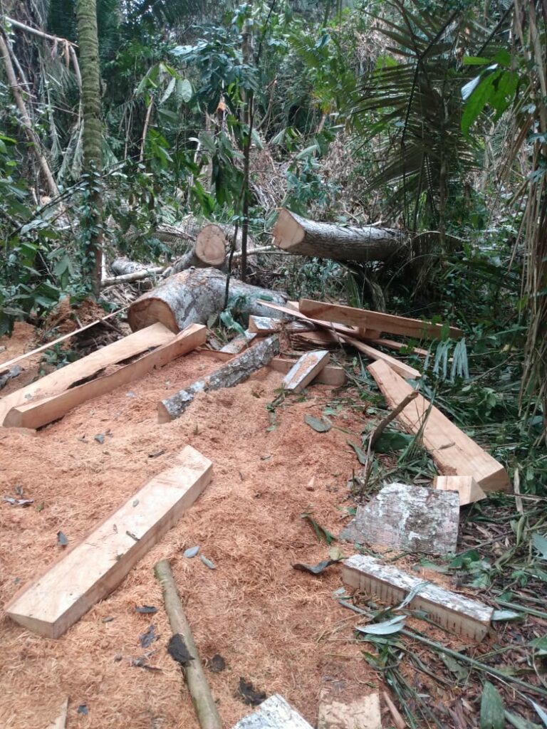 Na área os policiais constataram a derrubada de aproximadamente 35m³ de árvores abatidas, entre elas 2 duas samaúmas. O acusado pelo crime ambiental confessou ter feito o abate das árvores. Mediante os crimes de extração e transporte ilegal de madeira foi dada a voz de prisão ao autor e conduzido à delegacia de Cruzeiro do Sul para as providências cabíveis.