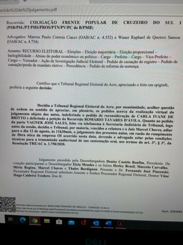 De acordo com a defesa do ex-prefeito Vagner Sales essa afirmação não tem fundamento algum, o advogado João Tota Filho disse que inclusive estava a caminho de Rio Branco para fazer a sustentação oral no julgamento que ocorrerá amanhã. Afirmou também que a audiência desta última segunda-feira (10), embora tenha faltado internet na cidade, só foi transferida para quarta-feira (12) em razão do pedido da defesa do Vagner Sales.