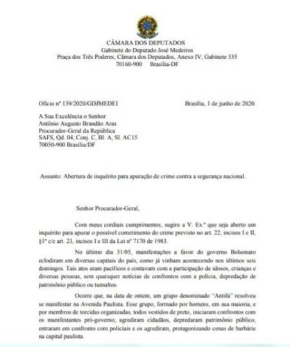 Medeiros justifica seu requerimento com base na lei de segurança nacional pela participação e apoio de Felipe Neto e os demais no ato chamado “Antifa”, que aconteceu em 31 de maio deste ano. De acordo com o pedido do deputado, o ato na Avenida Paulista foi violento. Para Medeiros os manifestantes “iniciaram confrontos com os manifestantes pró-governo, agrediram cidadãos, depredaram patrimônio público, entraram em confronto com policiais e os agrediram, protagonizando cenas de barbárie na capital paulista”.