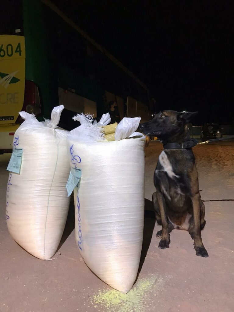 Nas buscas a polícia utilizou o cão farejador de drogas e armas. Durante as averiguações, foram localizados dois sacos de farinha contendo 18 “tijolos” de substância com odor e características de maconha, pesando aproximadamente 20kg. Não foi possível identificar o proprietário da substância pois os sacos foram despachados para que alguém os retirasse na rodoviária em Rio Branco.