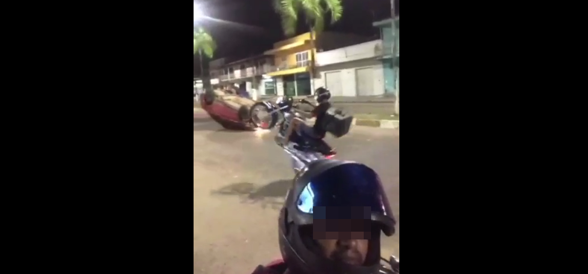 No vídeo um motociclista, aparentemente calçando apenas chinelos e com um box de entrega nas costas faz manobras arriscadas em frente a um carro capotado na avenida Mâncio Lima, ocorrido há cerca de 15 dias.