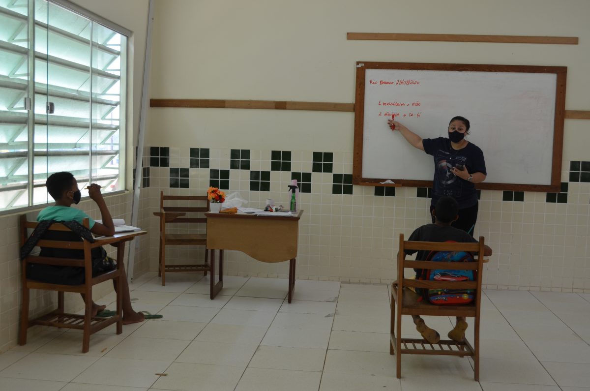 A partir daí, a escola passou a atender seis alunos distribuídos em duas turmas uma vez por semana, para resolverem as atividades e tirarem dúvidas com a professora. Também são atendidos três alunos com deficiências apoiados por mediadoras e intérpretes, pois os pais não tinham como ajudá-los em casa. Todos usando máscara, álcool em gel e obedecendo as regras de distanciamento.