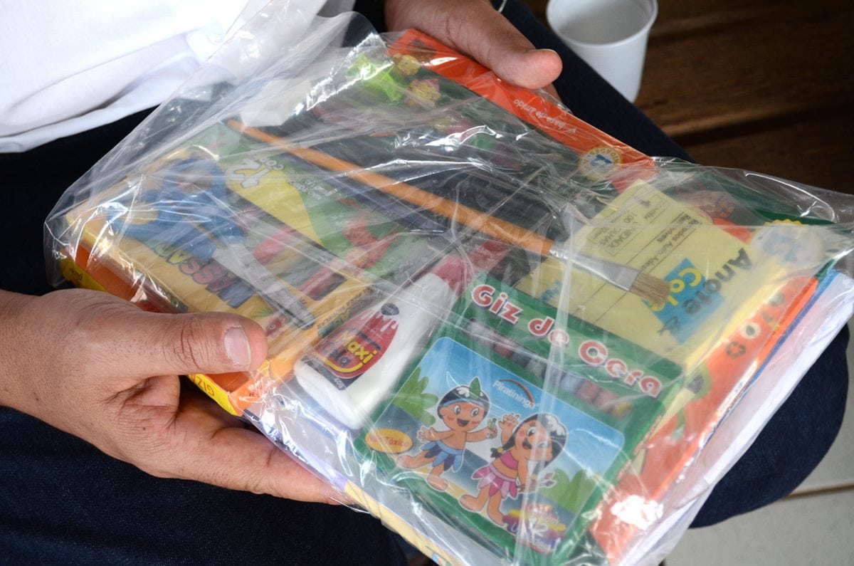 Cada um dos mais de 630 kits escolares entregues contém um caderno brochura de capa flexível, duas caixas de massinhas de modelar grossa, uma caixa de massinha de modelar fina, quatro caixas de giz de cera, cinco unidades de etiquetas de nota, além de seis pincéis número 6 e sete pincéis número 12.