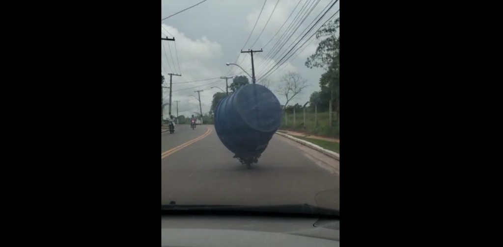 Homem é flagrado transportando caixa d’água em motocicleta; assista