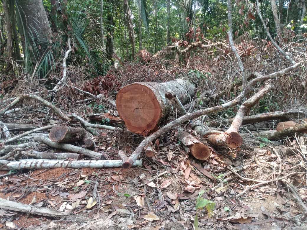 A polícia identificou nove pontos de extração ilegal de madeira, cinco pontos de queimadas e aproximadamente 6 metros cúbicos de madeira serrada no chão.