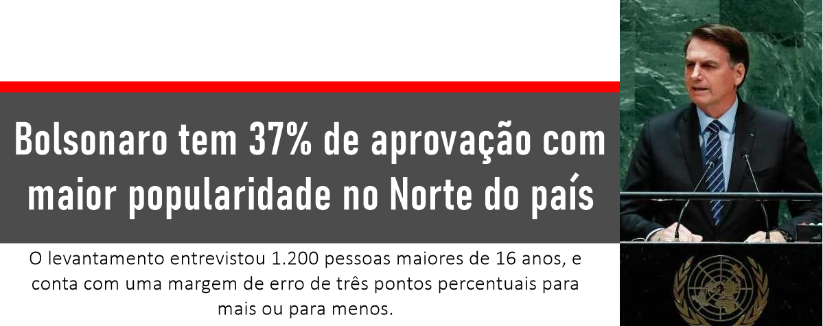 A popularidade do presidente Jair Bolsonaro (sem partido) atingiu 37% nos conceitos “ótimo/bom” segundo um levantamento realizado pela Exame Research, divulgada nesta sexta-feira (23). A pesquisa é realizada a cada quinzena e diagnosticou que a maior aprovação de Bolsonaro está concentrada na região Norte do país, com um total de 57%.