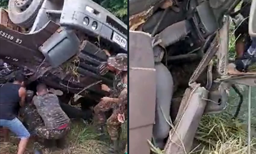 Imagens mostram uma caçamba do Exército tombada após o acidente, além do desespero de outros militares e pessoas que passavam pelo local para ajudar na retirada do motorista que ficou preso nas ferragens.
