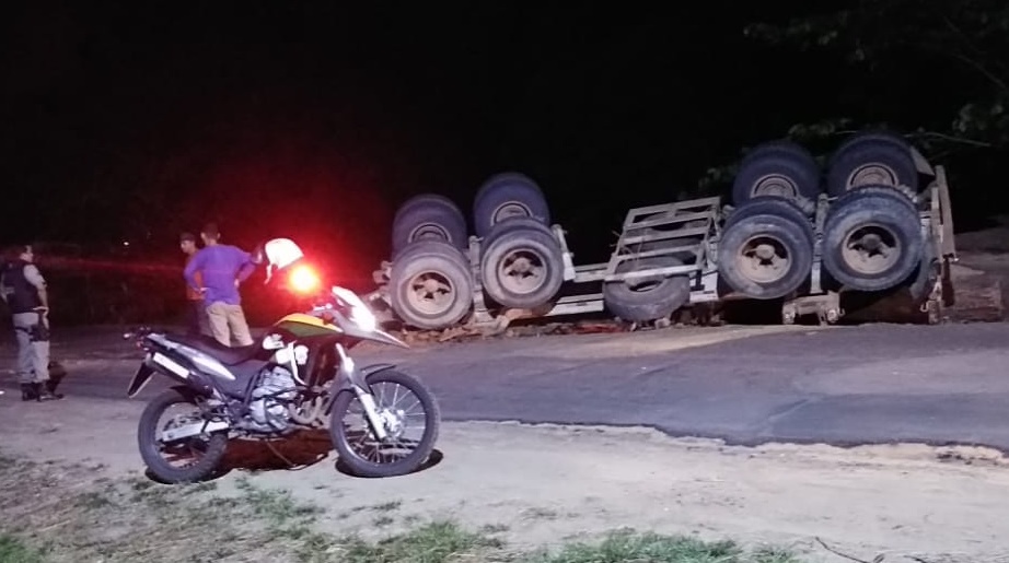 Um caminhão carregado de toras de madeira tombou na AC-405, nas proximidades da comunidade Pé da Terra, na noite deste domingo, 18, em Mâncio Lima.